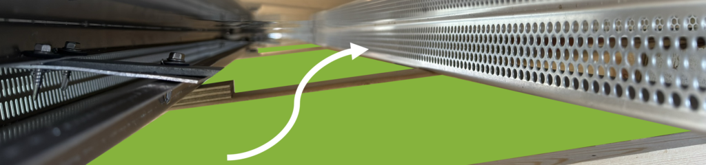 De integrerede ventilationsåbninger i Subskin undertagsprofilerne sikrer optimeret ventilation af taget. Derudover er ventilation på tværs af spærene en unik egenskab ved Subskin undertag, som reducerer risikoen for at der opstår zoner med stor damp- eller vandpåvirkning.